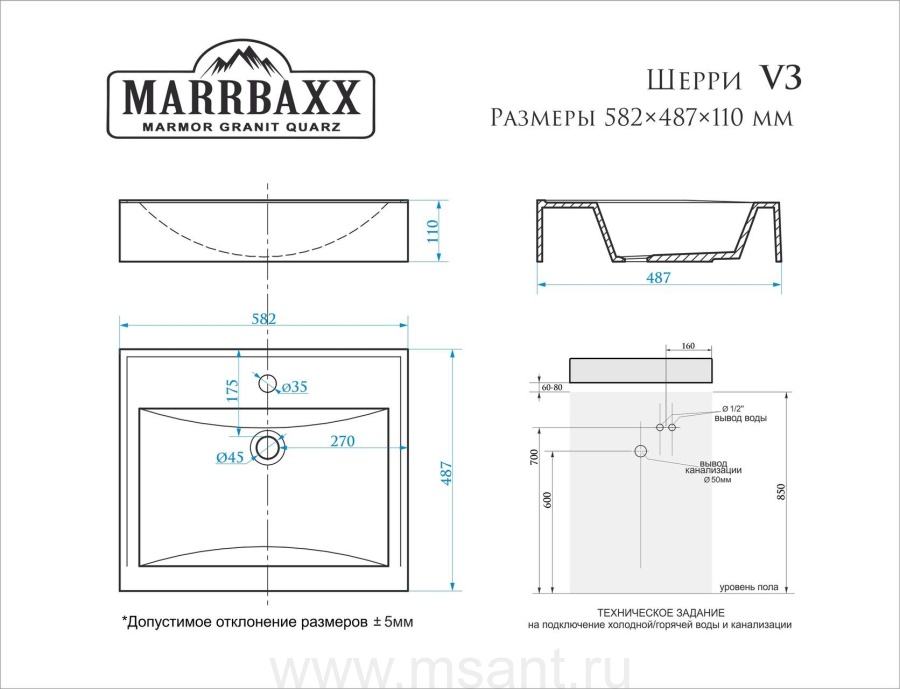 Умывальник на стиральную машину MARRBAXX Шерри V3 580 x 485 x 130
