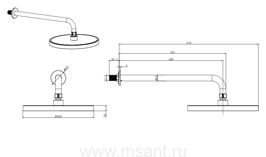 Верхний душ настенный 260мм AQUATEK, матовый черный AQ2080MB