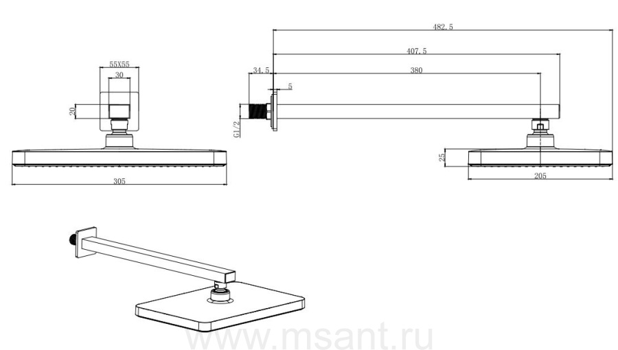 Верхний душ настенный 305х205мм AQUATEK, матовый черный AQ2081MB