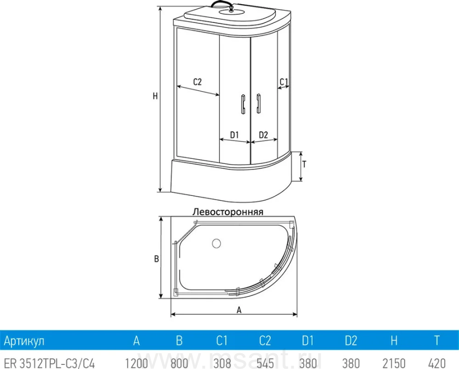 Душевая кабина Erlit Comfort ER3512TPL-C4-RUS с высоким поддоном, с сиденьем