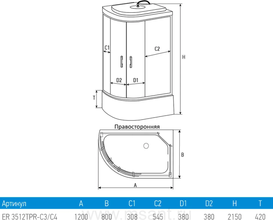 Душевая кабина Erlit Comfort ER3512TPR-C4-RUS с высоким поддоном, с сиденьем