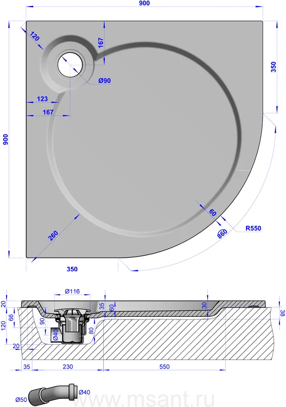 Поддон для душа GuteWetter Deluxe 90x90x2 R серый