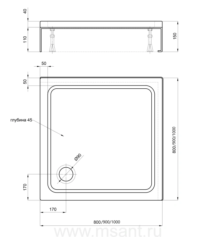 Душевой поддон акриловый AQUATEK 80*80*15 квадрат с ножками с фронтальным экраном, без сифона с уп.