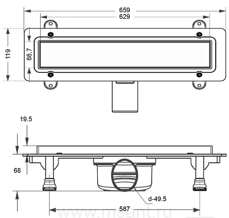 Душевой лоток LORANTO PRIME SKALA 60 см боковой сток D-50, 360*, решетка из нержавеющей стали под плитку, гидрозатвор сухой (4026.0Y050K.060.1)
