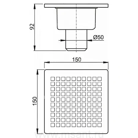Душевой трап Loranto LINE 150x150 мм прямой сток, решетка из нержавеющей, гидрозатвор сухой (3012.0A050K.015.1)