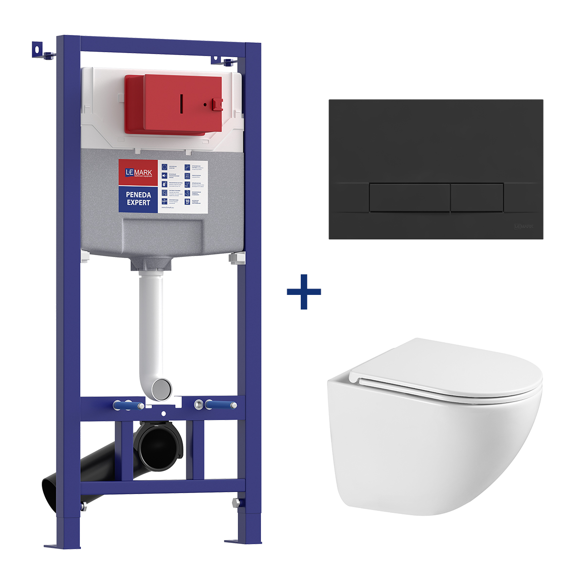 Комплект 3в1: 100122432 Инсталляция Lemark PENEDA EXPERT для унитазов с кнопкой смыва BIT чёрный матовый + унитаз подвесной безободковый GLAZER Торнадо белый глянец