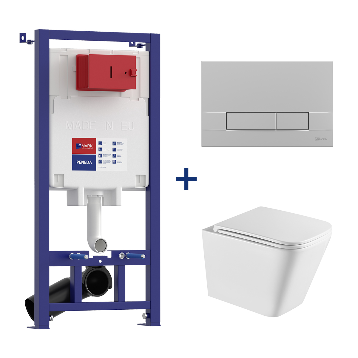 Комплект 3в1: 100803421 Инсталляция Lemark PENEDA для унитазов с кнопкой смыва BIT хром матовый + унитаз подвесной безободковый FLOREX Торнадо белый глянец
