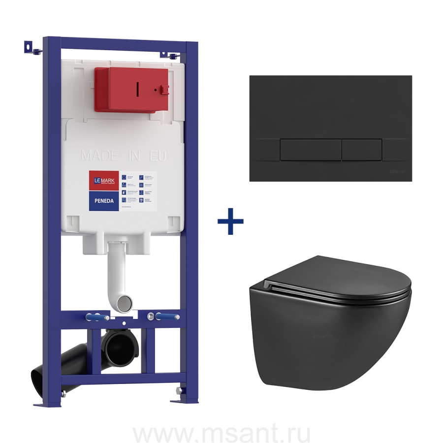 Комплект 3в1: Инсталляция Lemark PENEDA для унитазов с кнопкой смыва BIT чёрный матовый + унитаз подвесной безободковый GLAZER Торнадо чёрный матовый