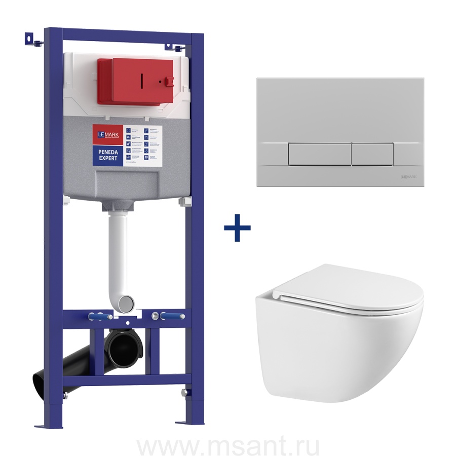 Комплект 3в1: Инсталляция Lemark PENEDA EXPERT для унитазов с кнопкой смыва BIT хром матовый + унитаз подвесной безободковый GLAZER Торнадо белый глянец