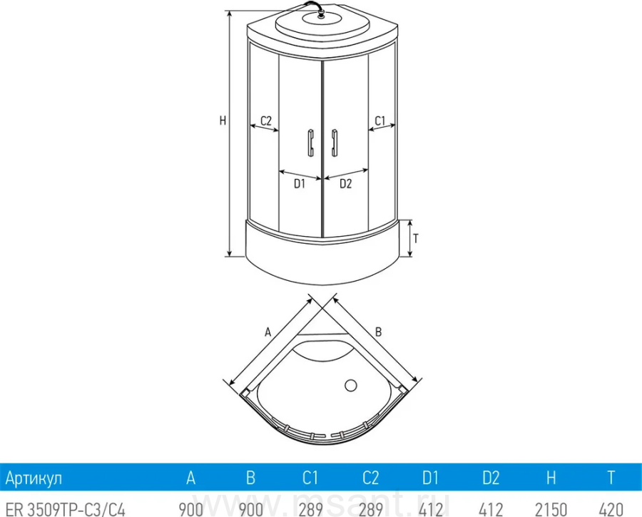 Душевая кабина Erlit Comfort ER3509TP-C3-RUS с высоким поддоном, с сиденьем