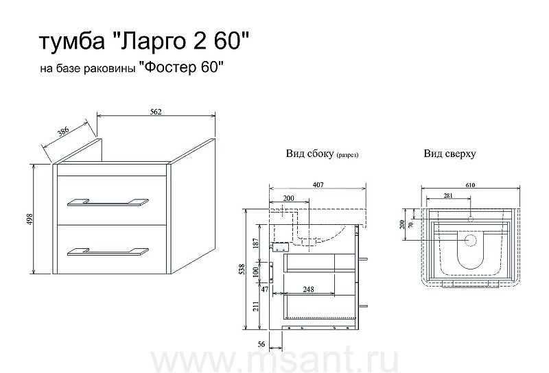 Тумба Sanflor подвесная Ларго 60.2 (ШВ/Б) раковина Фостер 60