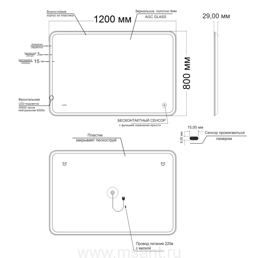 Зеркало MIXLINE "Турин" 1200*800 (ШВ) бесконтактный сенсор, светодиодная подсветка