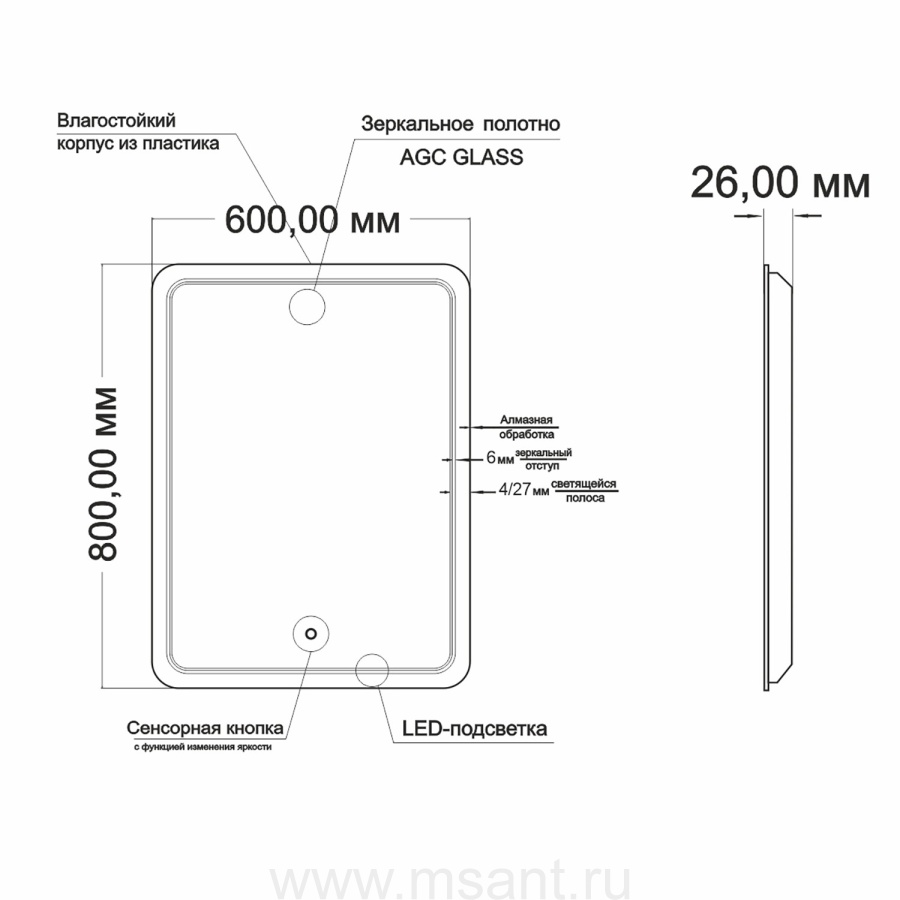 Зеркало MIXLINE "Умберто" 600*800 (ШВ) сенсорный выключатель, светодиодная подсветка