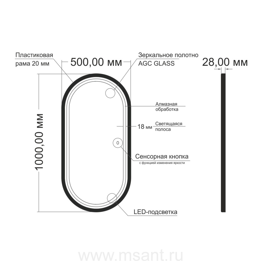 Зеркало MIXLINE "Виола-лофт" 500*1000 (ШВ) пластик. рама, сенсорный выключатель, гор/верт крепеж