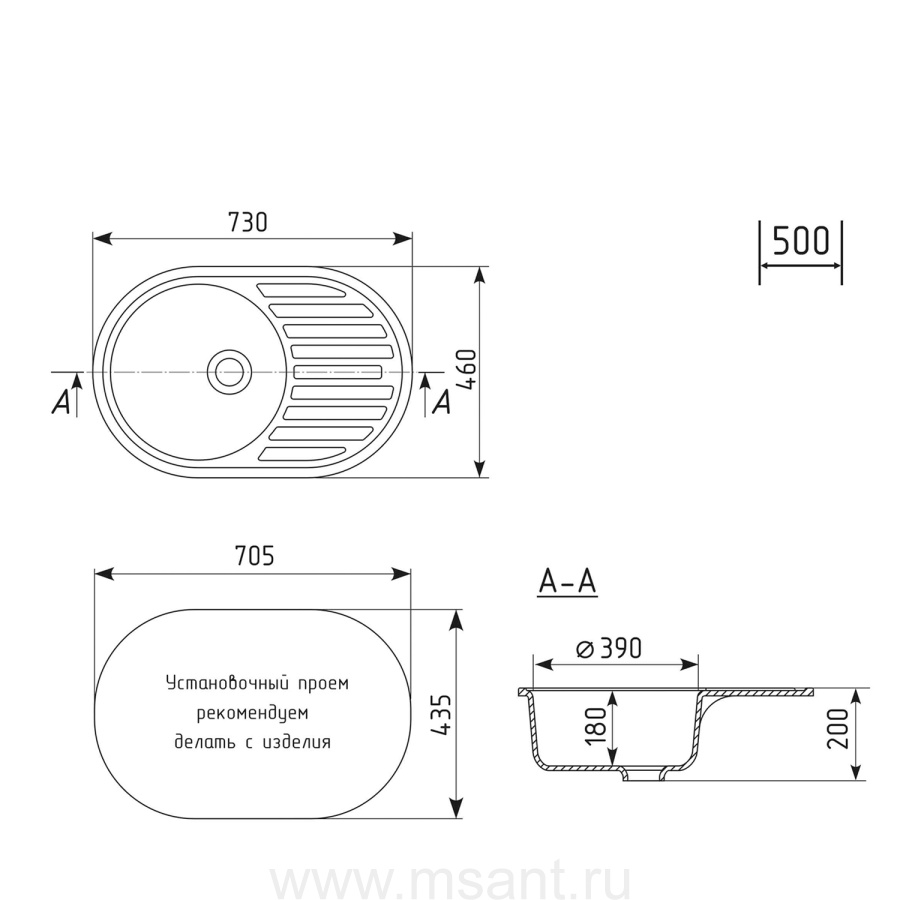 Мойкa MIXLINE ML-GM16 овальная с крылом, темно-серая (309), 730*460*180мм