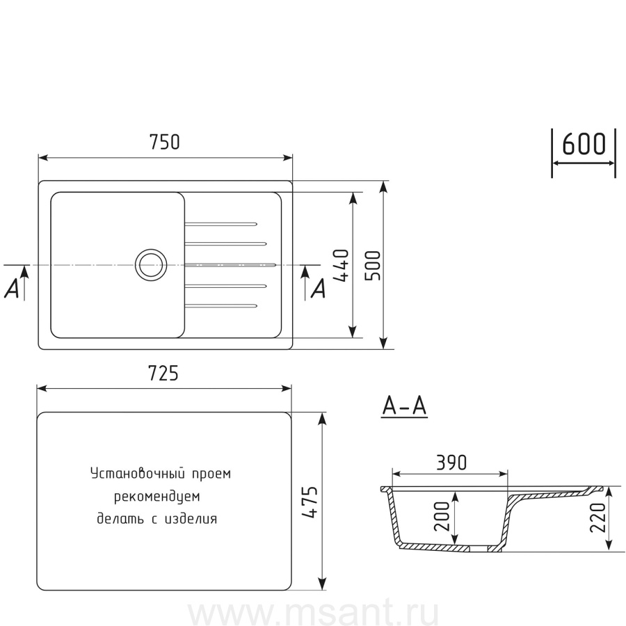 Мойкa MIXLINE ML-GM19 с крылом, ультра-белая (341), 750*500*200мм