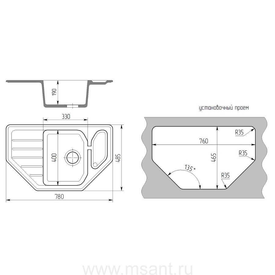Мойкa MIXLINE ML-GMS17 СТАНДАРТ угловая с крылом, белый (331), 780*485*190мм