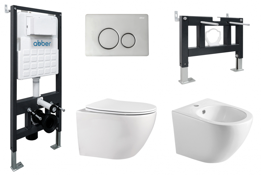Комплект ABBER унитаз AC1100 белый с инсталляцией AC0105 и кнопкой AC0121 хром, биде AC1150 с инсталляцией AC0101P