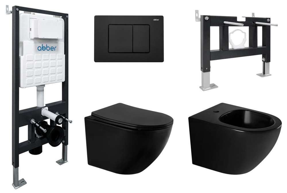 Комплект ABBER унитаз AC1100MB черный матовый с инсталляцией AC0105 и кнопкой AC0120MB, биде AC1150MB с инсталляцией AC0101P