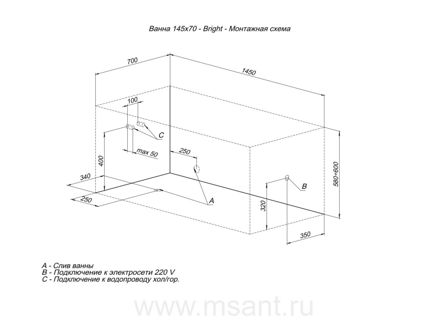 Акриловая ванна Aquanet Bright 145x70 (с каркасом)