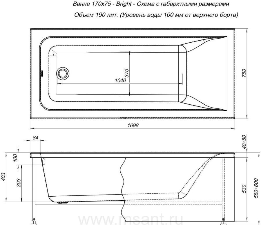Акриловая ванна Aquanet Bright 170x75 (с каркасом)