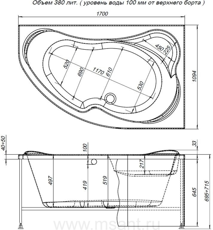 Акриловая ванна Aquanet Capri 170x110 R (с каркасом)
