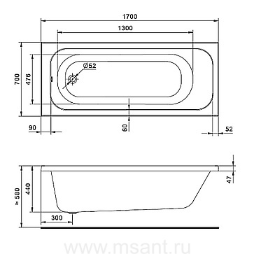 Акриловая ванна Santek Ламма 170х70 прямоугольная 1WH501747