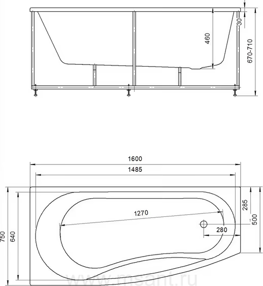Акриловая ванна Акватек Пандора 160x75 L, с каркасом, сливом-переливом, без фронтального экрана
