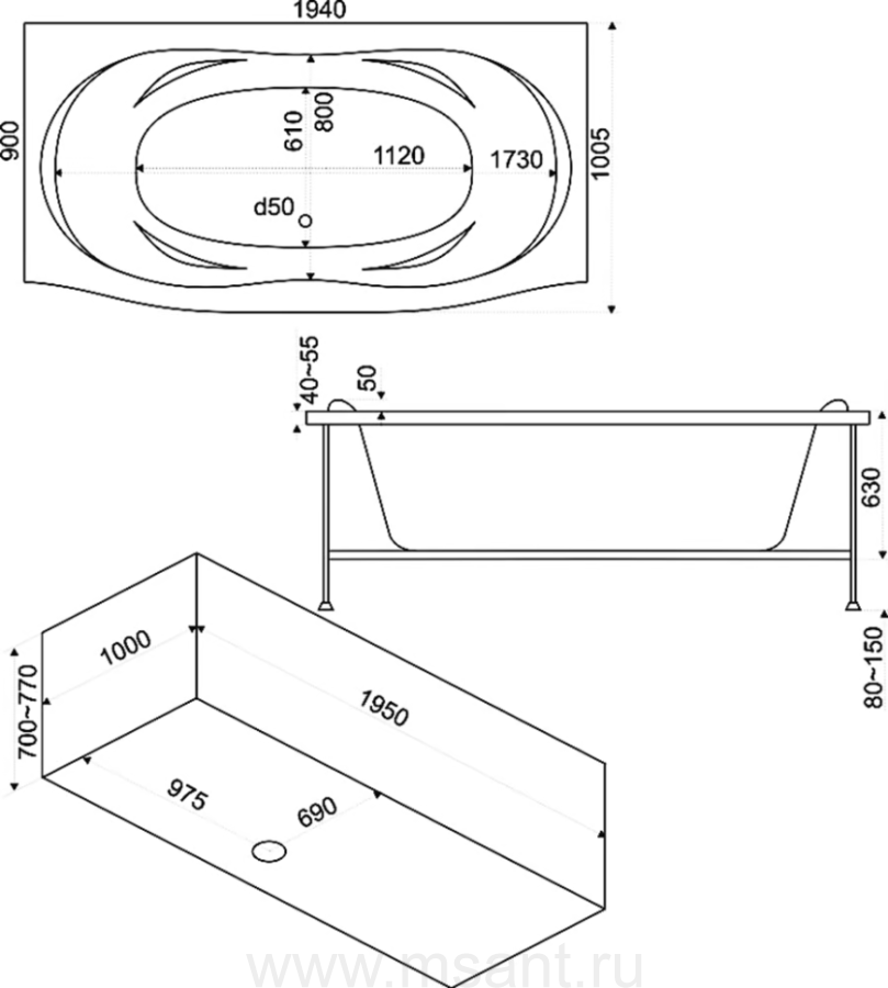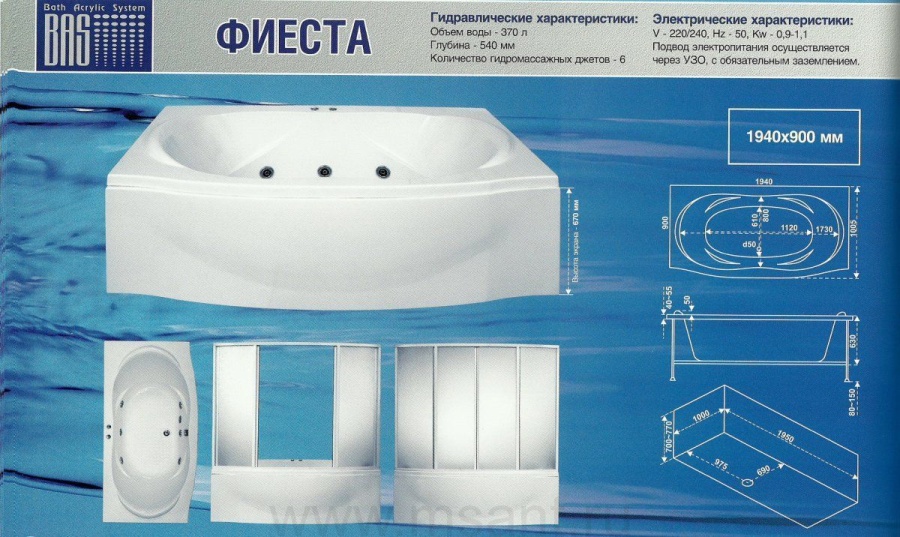Акриловая ванна BAS Фиеста 194x90 на каркасе