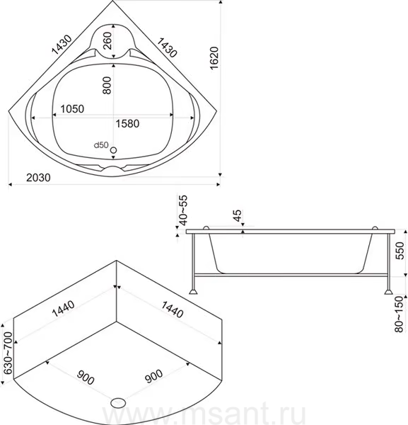 Акриловая ванна BAS Хатива 143x143, на каркасе