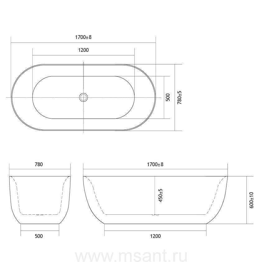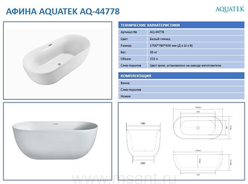 Ванна акриловая,отдельностоящая AQUATEK AQ-44778 АФИНА, 1700*780*600. В комплекте со сливом и ножками. Цвет: белый глянцевый. .