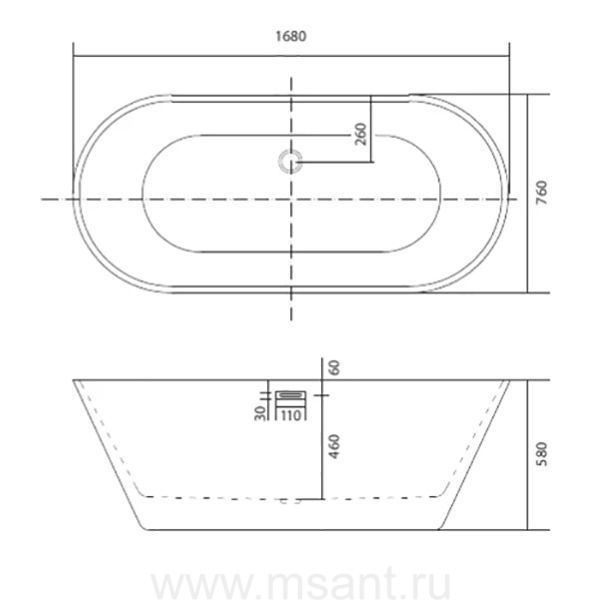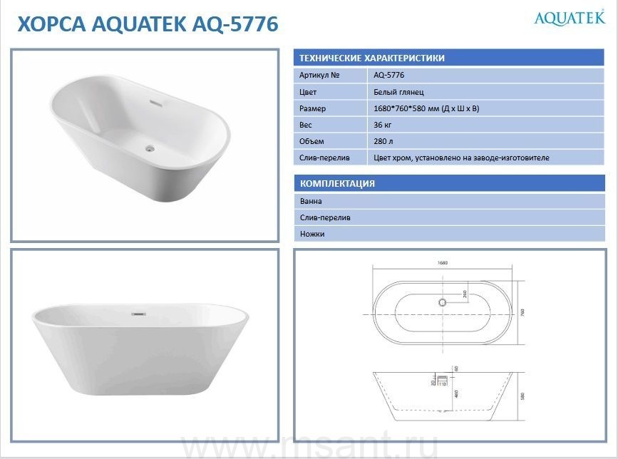 Ванна акриловая,отдельностоящая, AQUATEK AQ-5776 ХОРСА 1680*760*580. В комплекте со сливом и ножками.Цвет: белый глянцевый.