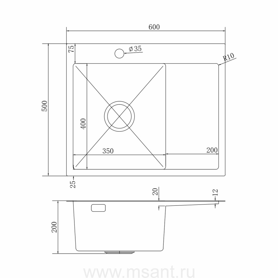 Мойка настол.монтаж 60х50 (3,0) лев. вып 3 1/2 MIXLINE PRO 20см с сифоном (сатин)