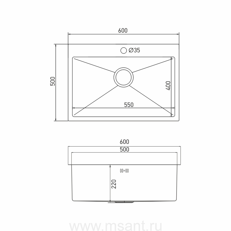 Мойка настол.монтаж 60х50 (3,0) вып 3 1/2 MIXLINE PRO 22см с сифоном (бронза)