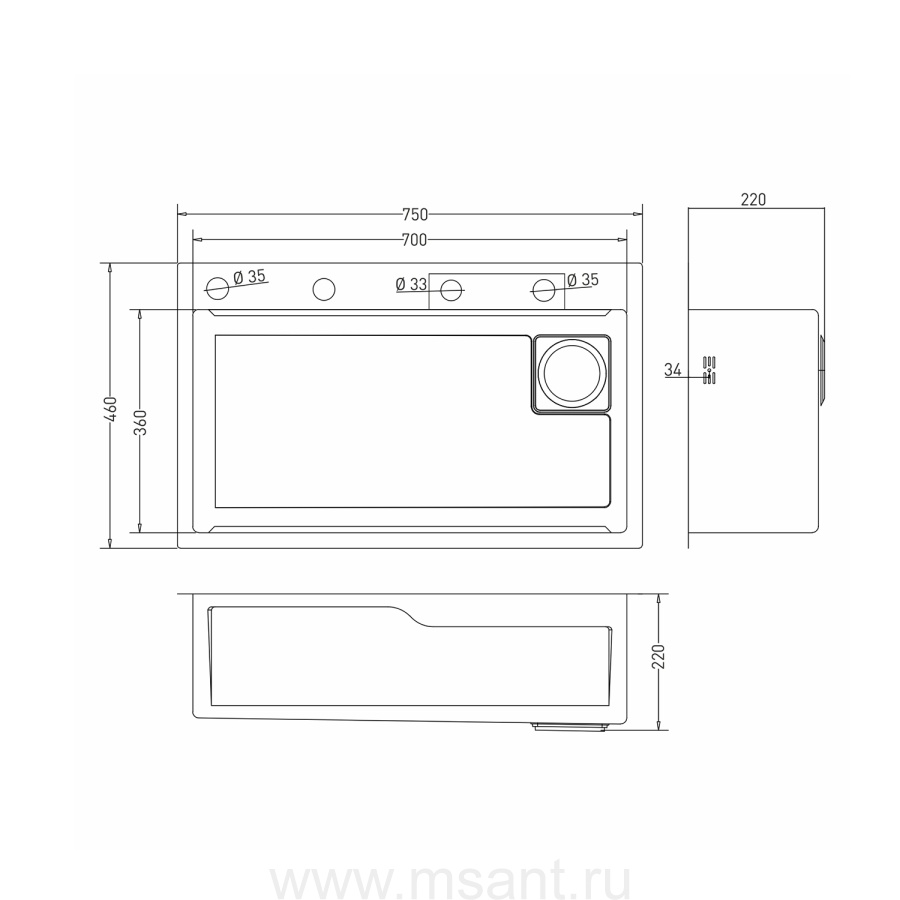 Мойка настол.монтаж 75х46 (3,0) вып 3 1/2 MIXLINE PRO 21,5см с сиф.(сатин)+доз+смесит+кол+д/р+о/с