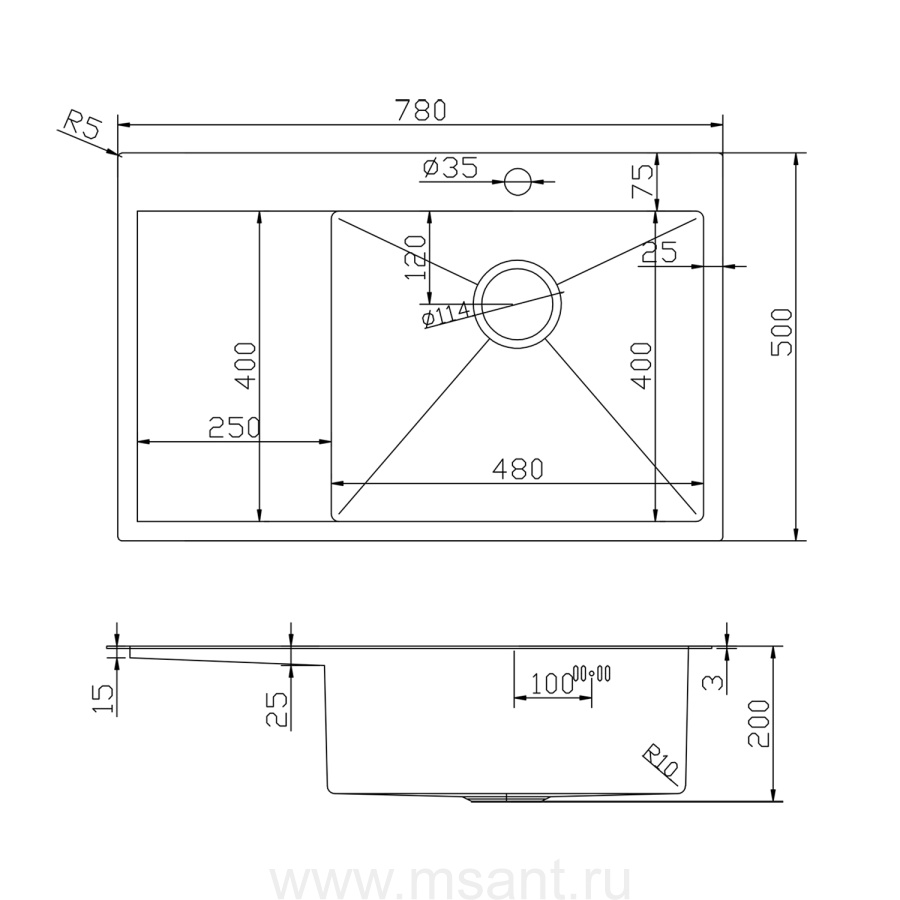 Мойка настол.монтаж 78х50 (3,0) прав. вып 3 1/2 MIXLINE PRO 20см с сифоном (бронза)