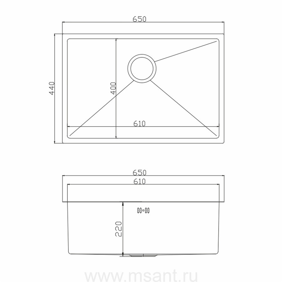 Мойка подст.монтаж 65х44 (3,0) вып 3 1/2 MIXLINE PRO 22см с сифоном (черный графит)