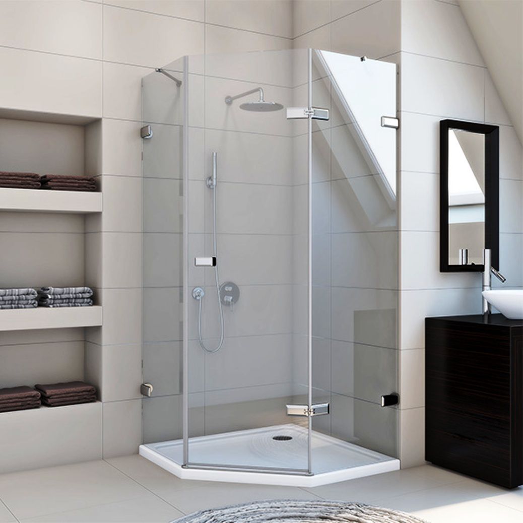 Душевое ограждение пятиугольное трехсегментное с открыванием двери наружу или в обе стороны в стандартном и индивидуальном исполнении