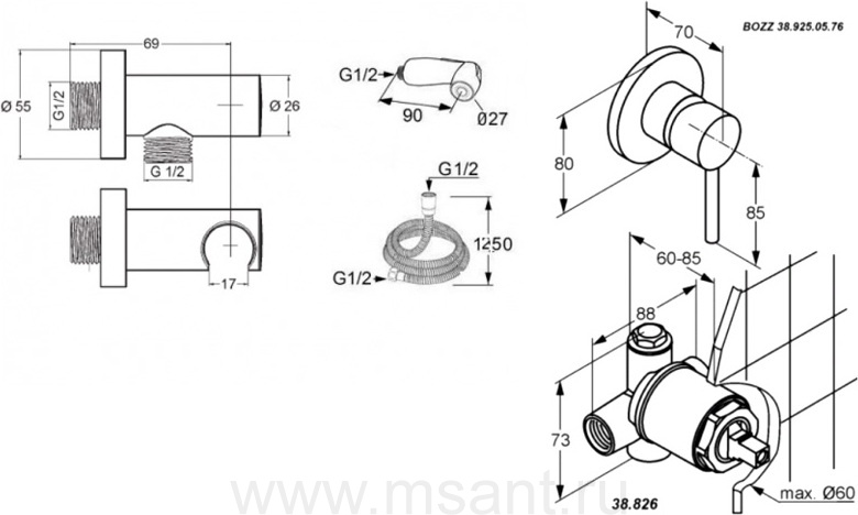 Гигиенический душ Kludi Bozz 389990576 со смесителем, С ВНУТРЕННЕЙ ЧАСТЬЮ