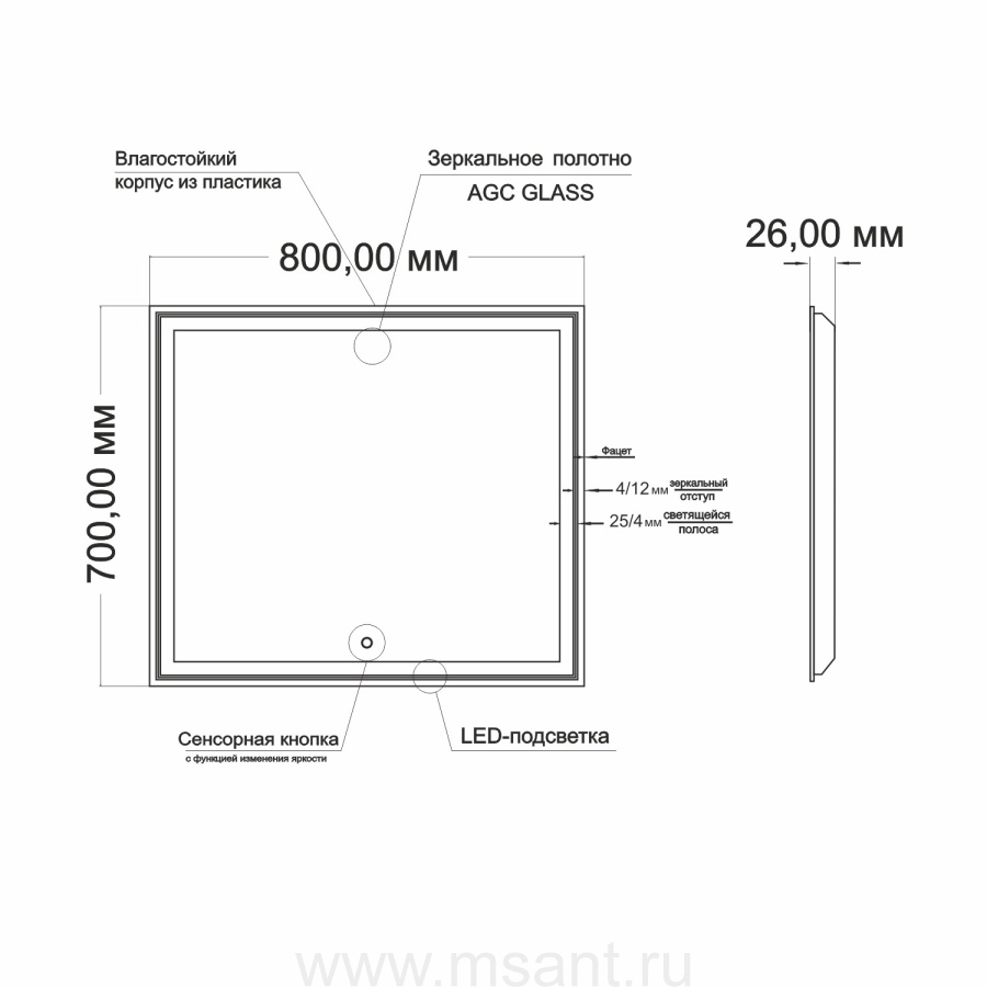 Зеркало MIXLINE "Мелис" 800*700 (ШВ) сенсорный выключатель, светодиодная подсветка