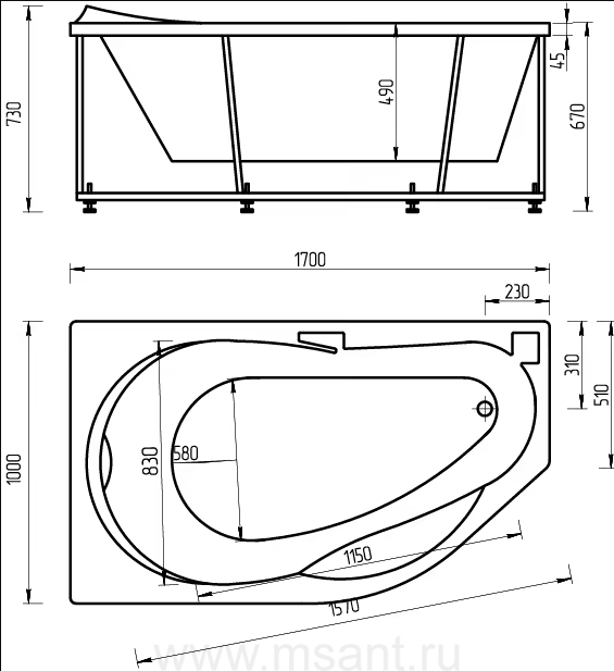 Акриловая ванна Aquatek Таурус 170x100 L, с каркасом, фронтальным экраном, сливом-переливом
