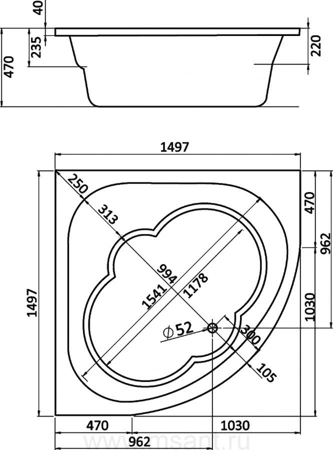 Акриловая ванна Santek Канны 150х150 1.WH11.1.983